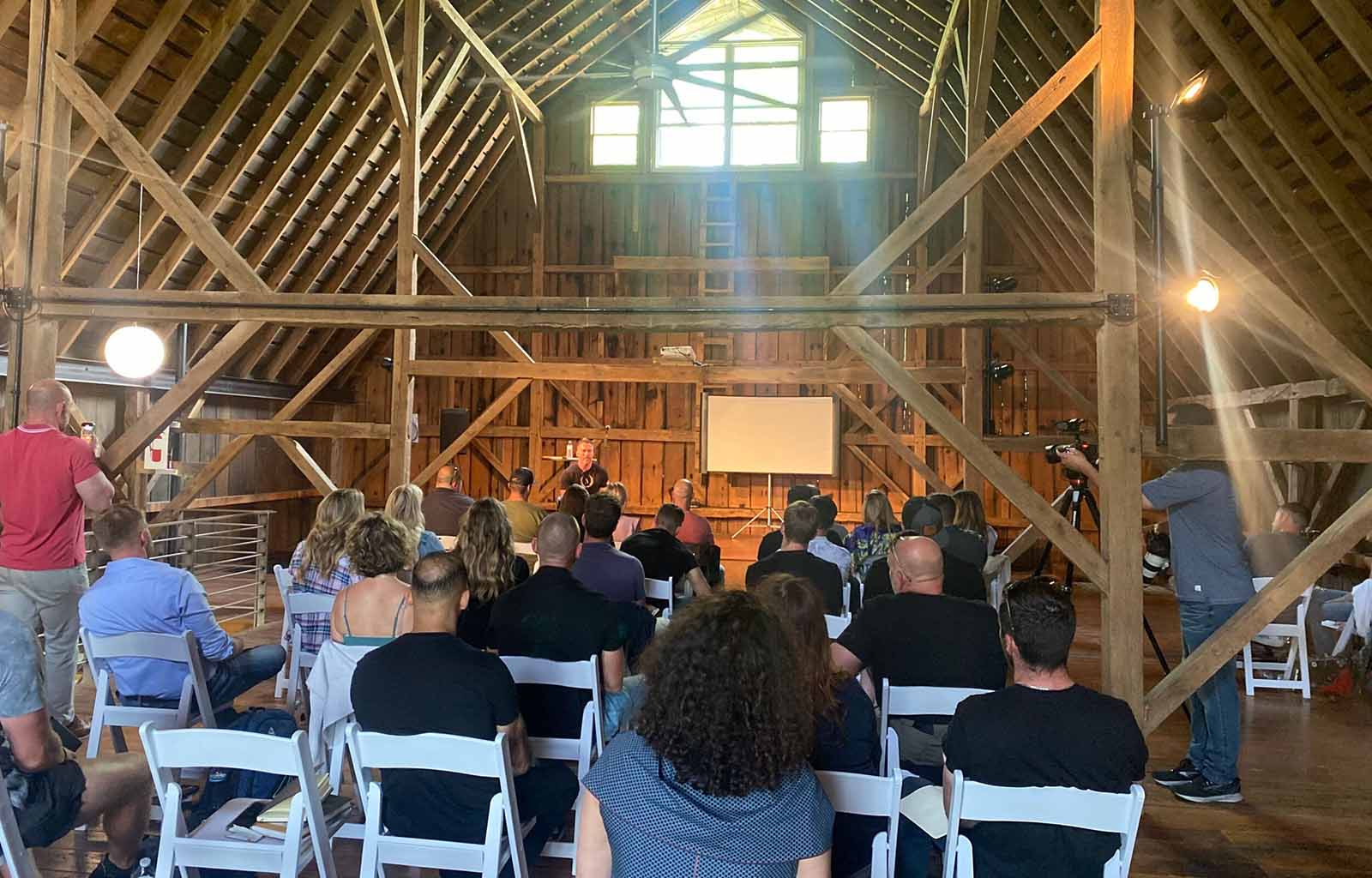 Original timber beams, exposed wood throughout, and the kind of structure that doesn't apologize for its age—it wears it well. The lower level is climate-controlled to make it work year-round, while the upper level keeps the traditional barn character—high ceilings, a massive ceiling fan, and wood everywhere you look.