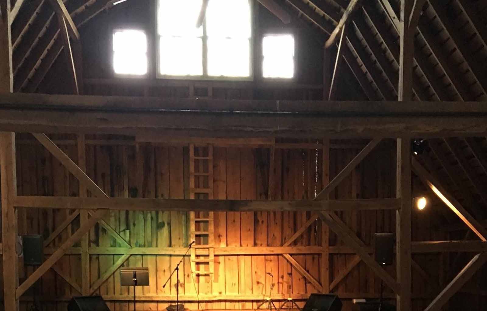 The ground floor is open and flexible, with climate control that works regardless of the season. The upper level is where the original architecture really shows—wooden pillars, exposed rafters, and a professional stage with mounted lighting that can adapt to whatever's happening. The acoustics are better than you'd expect from a building this old, and the space handles both intimate gatherings and larger groups without feeling like it's trying too hard.